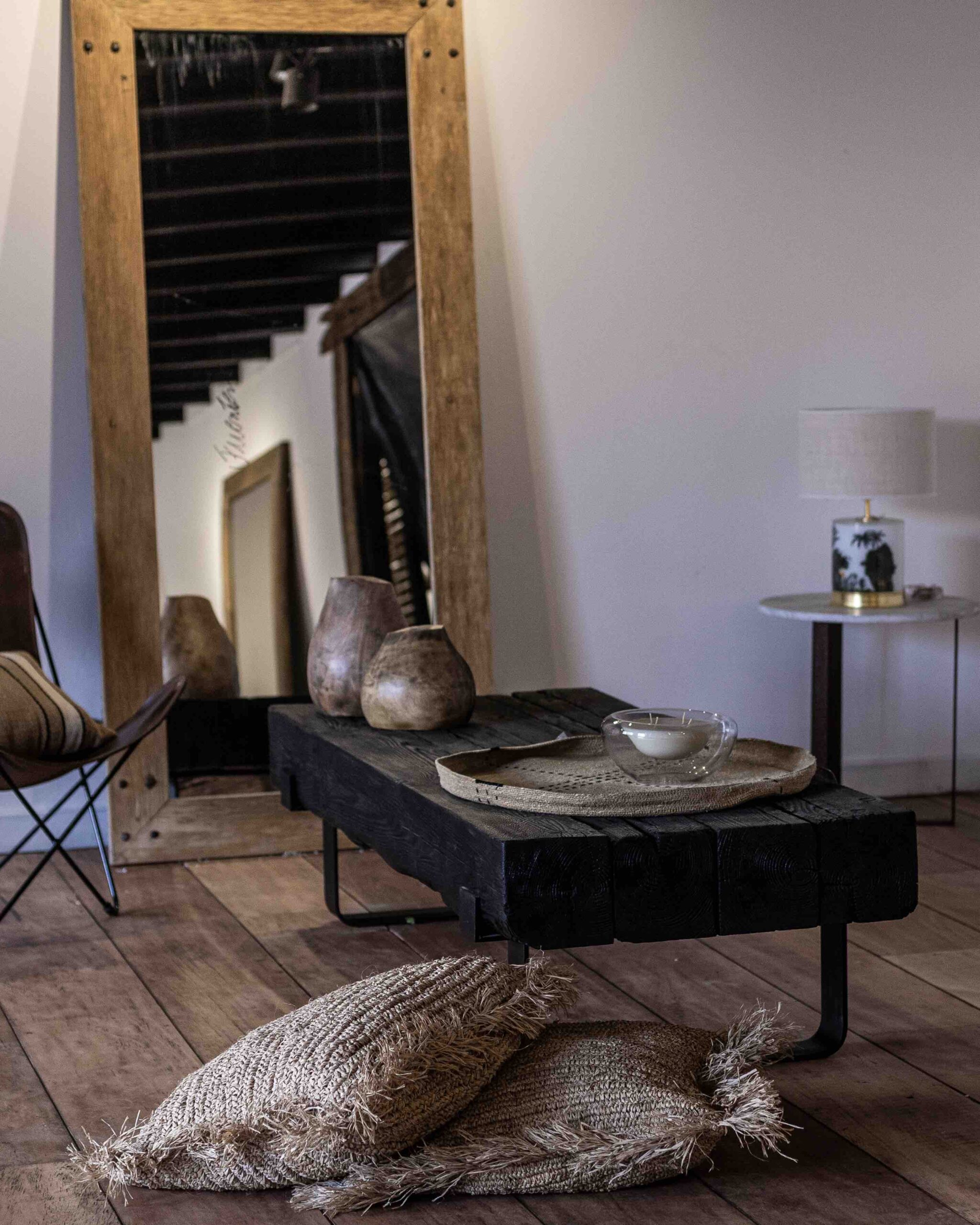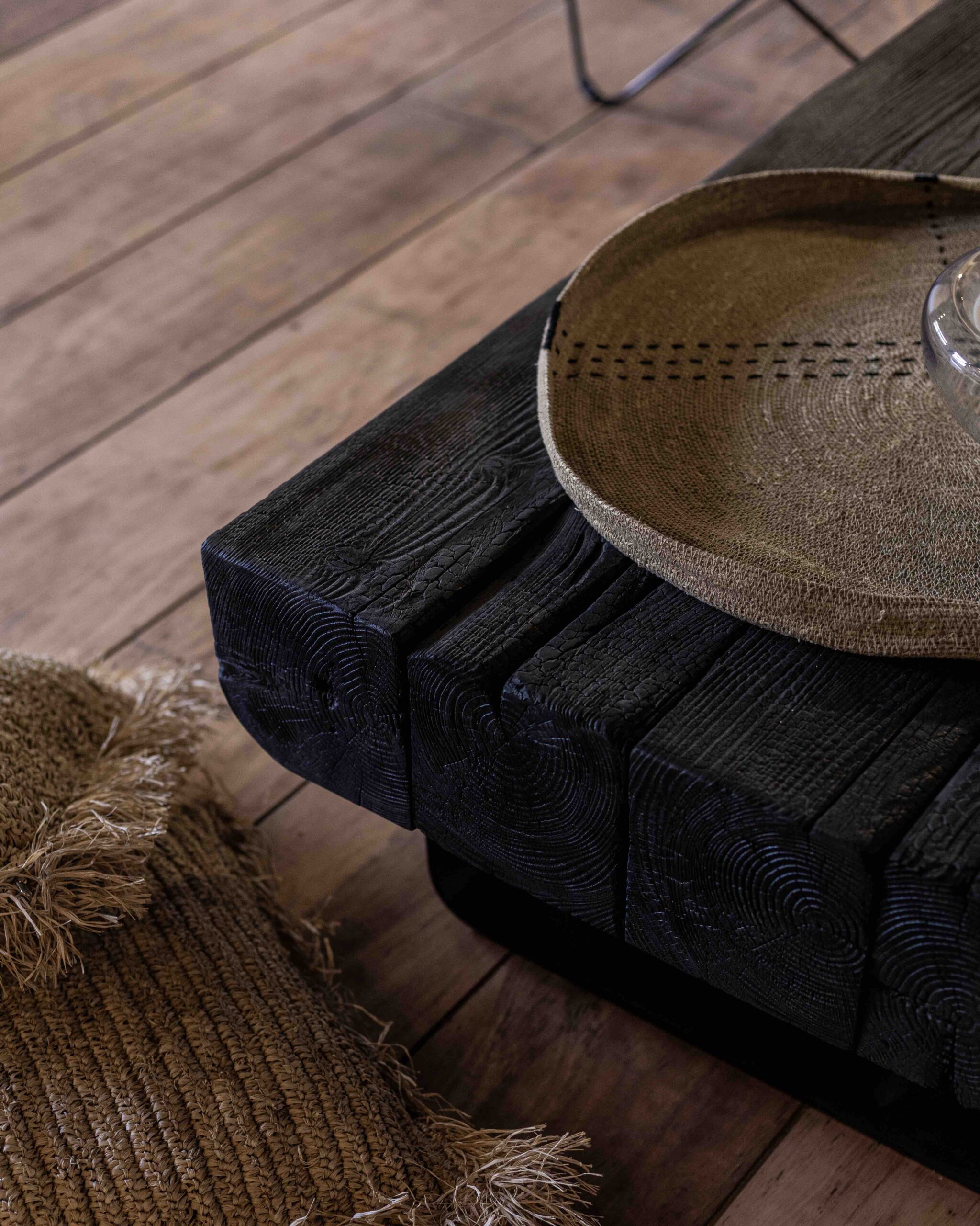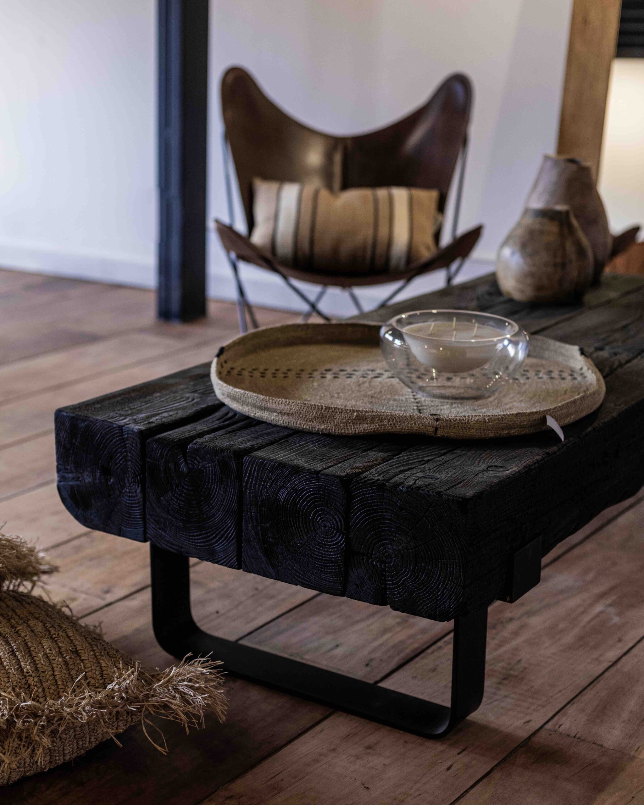 Mesa ratona en madera quemada con pata en hierro.